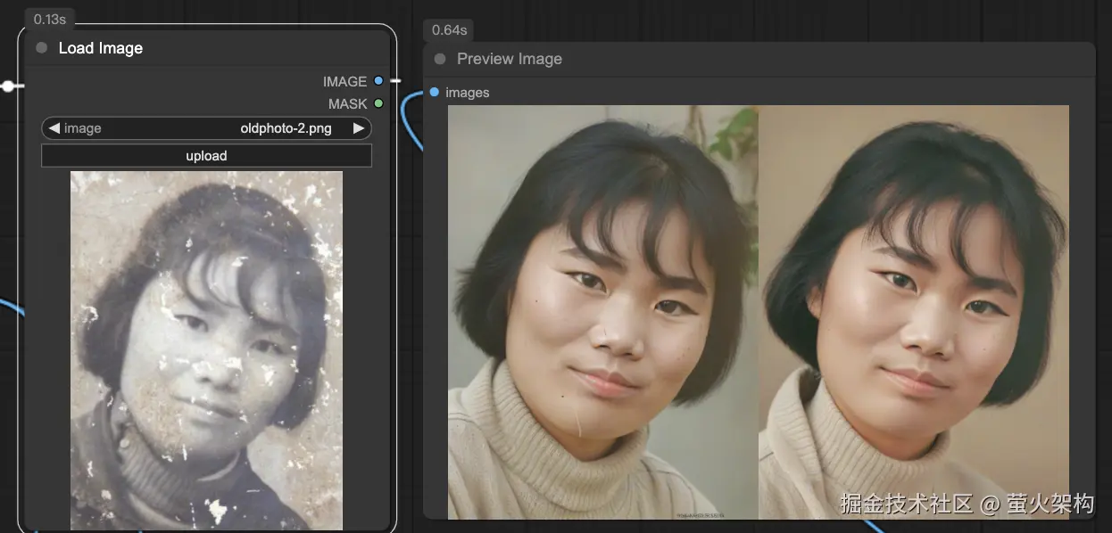 本文主要介绍使用ComfyUI工作流修复老照片的方法,经过最近几天的研究,不仅可以修复普通的模糊老照片、也可以修复有污渍、划痕和破损的老照片。使用ComfyUI工作流,我们还可以做到:只上传一张老照片,然后一键修复,无需输入任何提示词。