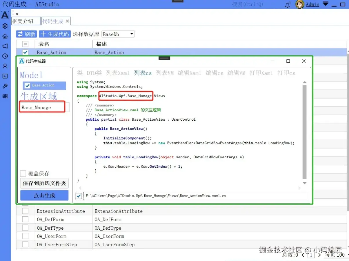选择代码生成菜单,选中查询回来的新表,区域为你所加界面的工程,比如默认值Base_Manage,将把页面加到AIStudio.Wpf.Base_Manage工程下。