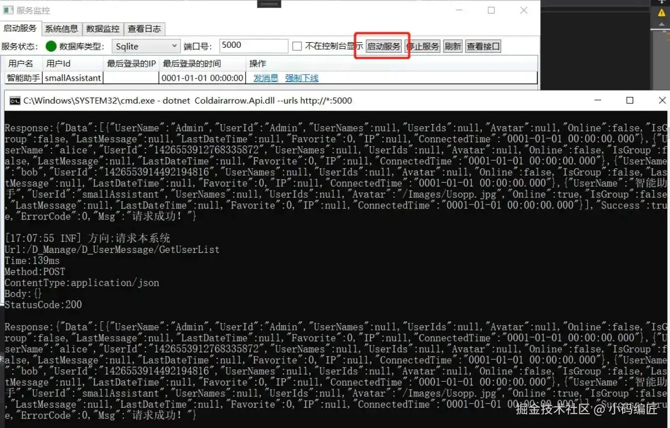 启动ServiceMonitor,点击启动服务,待本地服务启动后,可运行客户端进行连接。