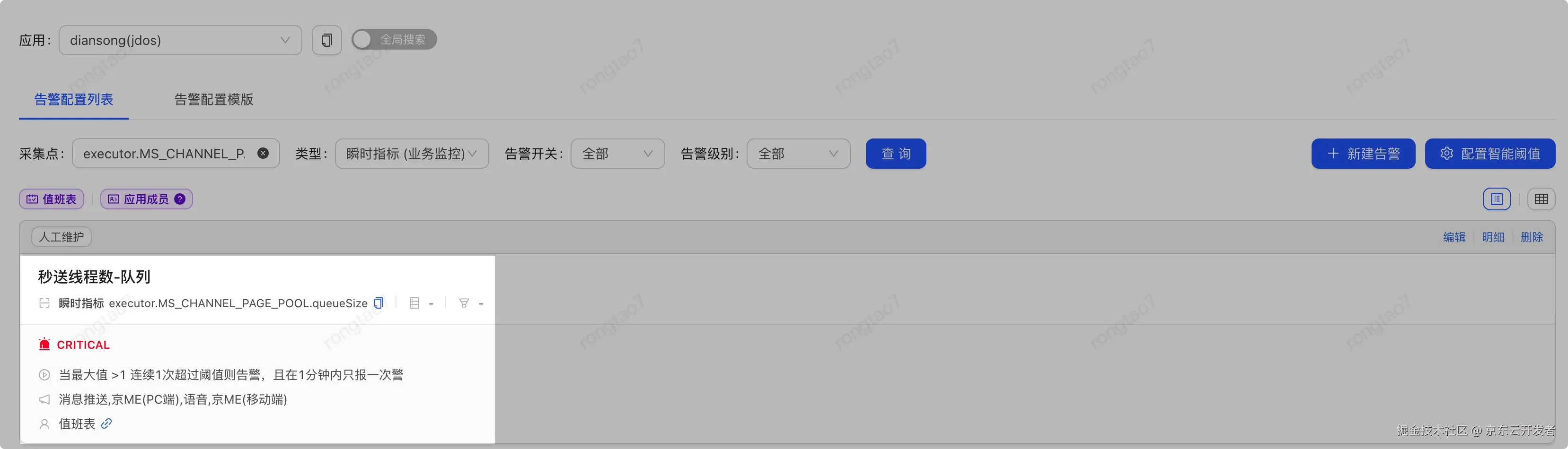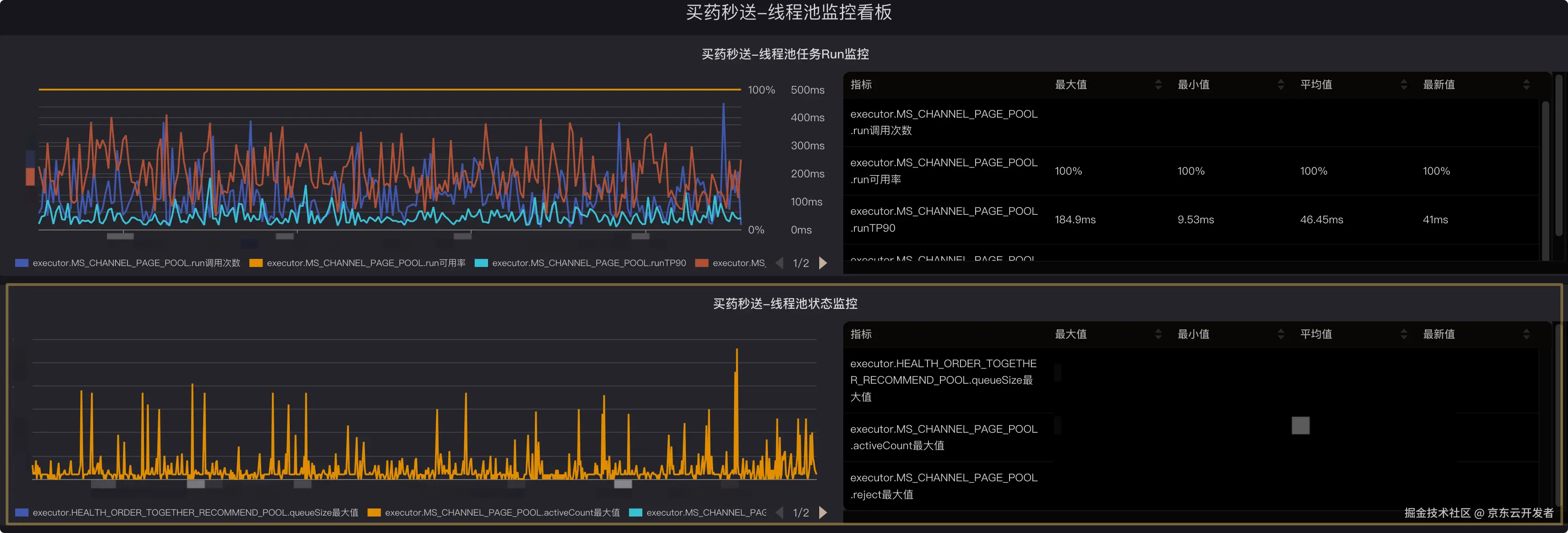 接入JADE和万象后,买药秒送线程池秒级监控效果如下:实时监控线程池运行状态 以及 阈值报警。