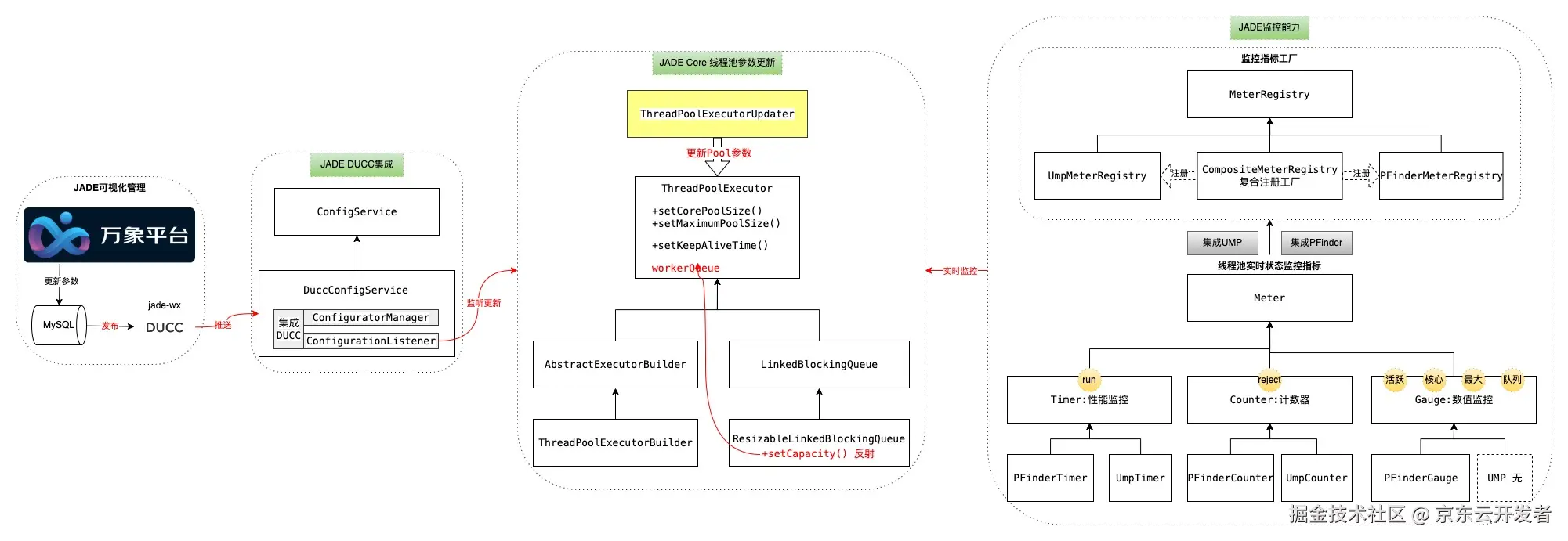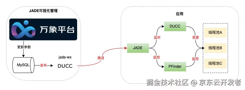 JADE动态线程池和万象整体流程图如下:应用中需要引入 JADE、DUCC和 PFinder SDK,通过JADE创建线程池,线程池核心参数通过万象平台配置,集成 DUCC 实现动态调参,即时生效。线程池运行状态监控通过 PFinder 实现秒级监控。