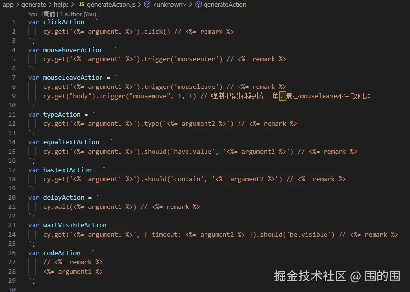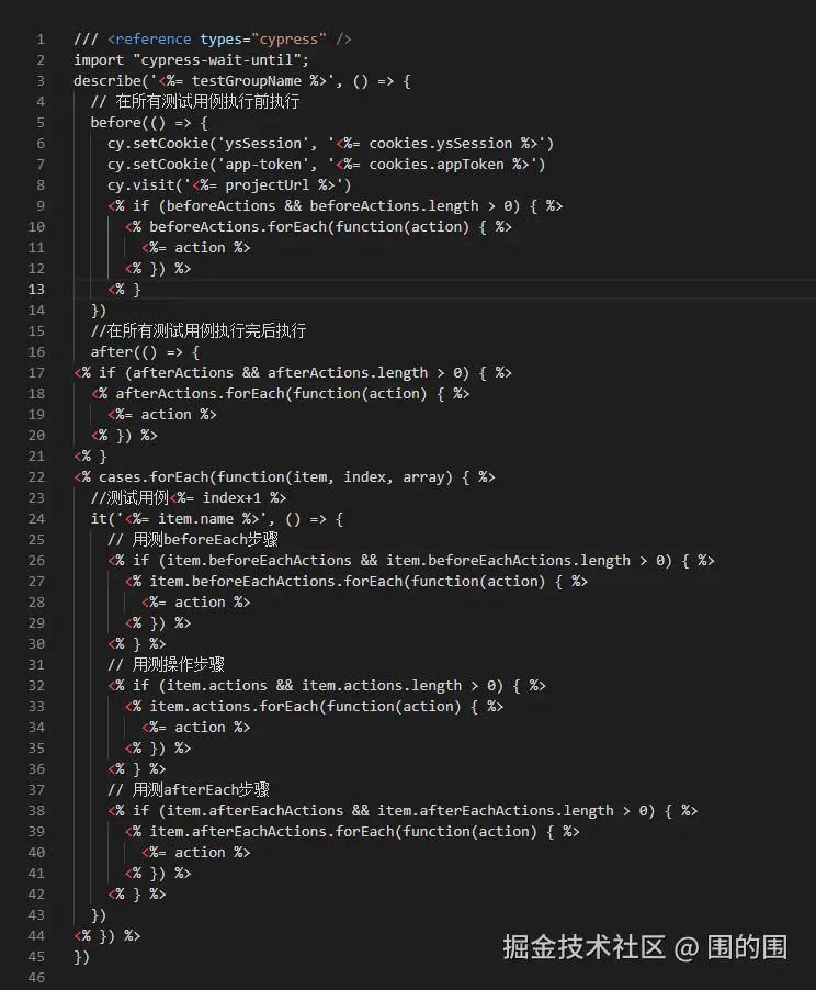 借助ejs模版能力可以轻松完成生成自动化脚本文件的操作,先把ejs模版定义好 app/generate/ejs/case.cy.ejs