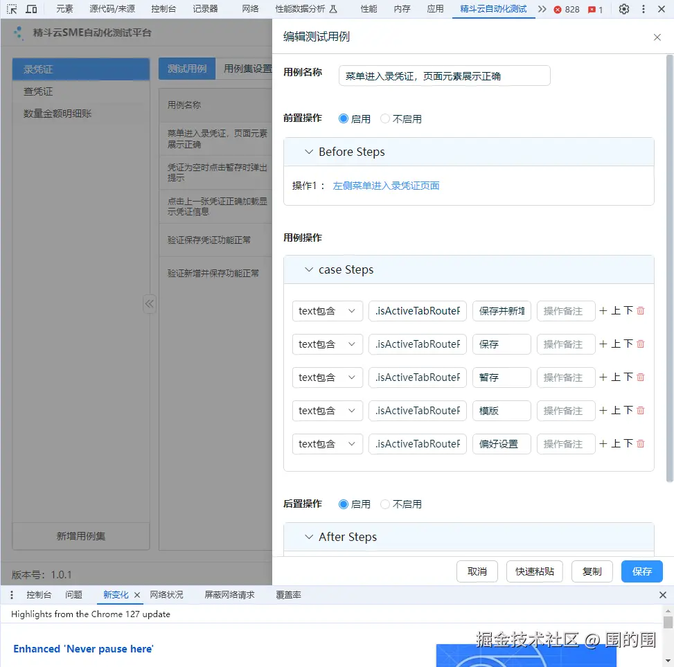 为了更方便的编写和调试测试用例代码,我们可以把测试用例管理的前端页面通过chrome插件添加到页面调试面板上去,这样就可以边操作页面元素,边维护自动化测试用例,还可以通过chrome调试面板的元素查看页面的HTML结构。借助于chrome插件提供的能力,可以直接和页面进行互动,更方便的调试测试用例,和检测用例是否执行符合预期