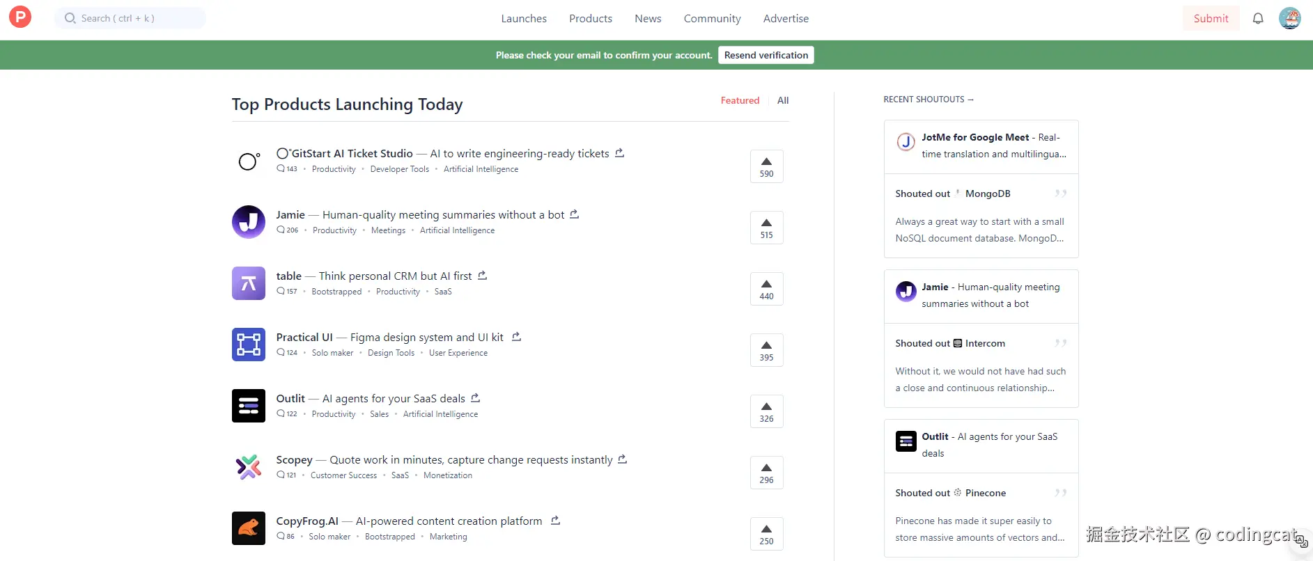 首页就是今天发布的产品排行榜,按点赞数量排序,往下滑也能看到上周,上个月的产品排行榜,简单直接。如果产品能登上这个排行榜,那就能获得很多的曝光。这里插一嘴,产品的 logo,slogan 在这个列表页显得十分重要,描述必须要精准,logo最好精致,以便于快速抓住用户的眼球。