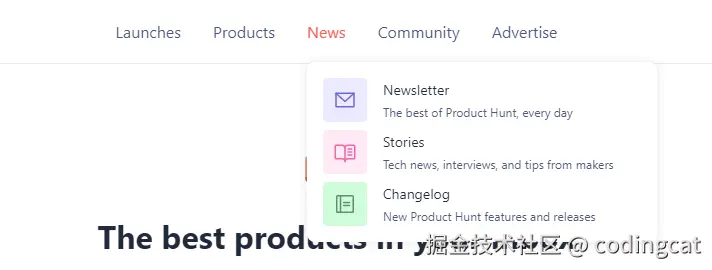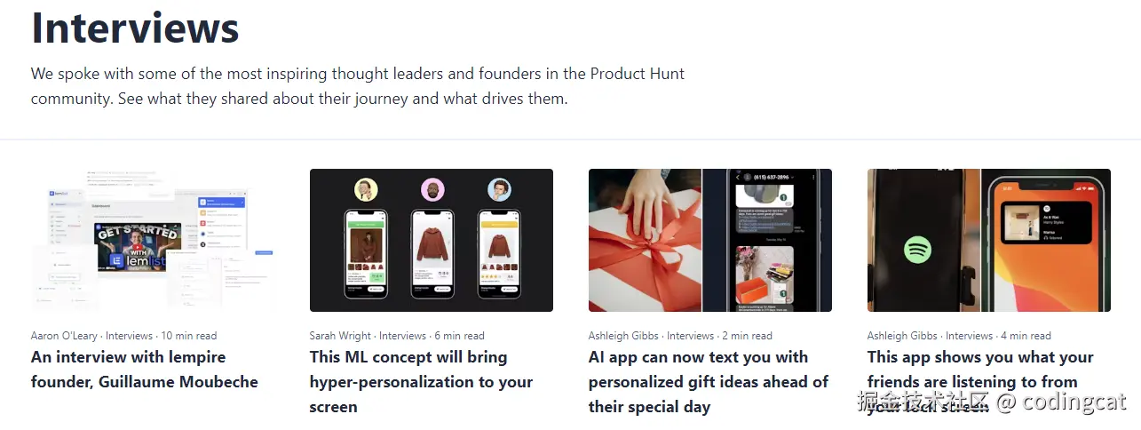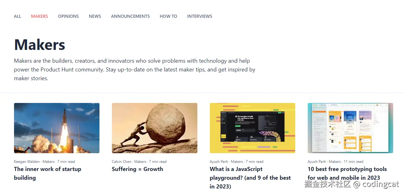 在这里可以订阅产品发布通知,查看技术开发者的故事,以及 product hunt 的发布日志。