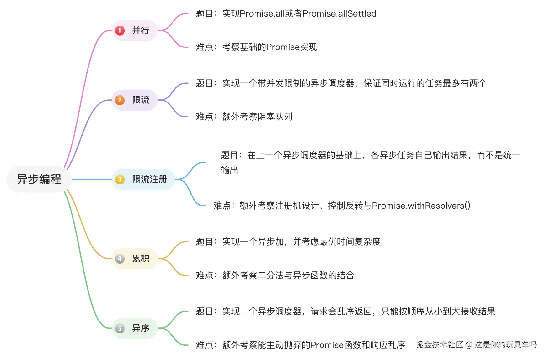 异步编程Promise相关的题目是近年前端笔试的常客,本系列总结了5种类型,包含1种基础和4种变种,思维导图如下: