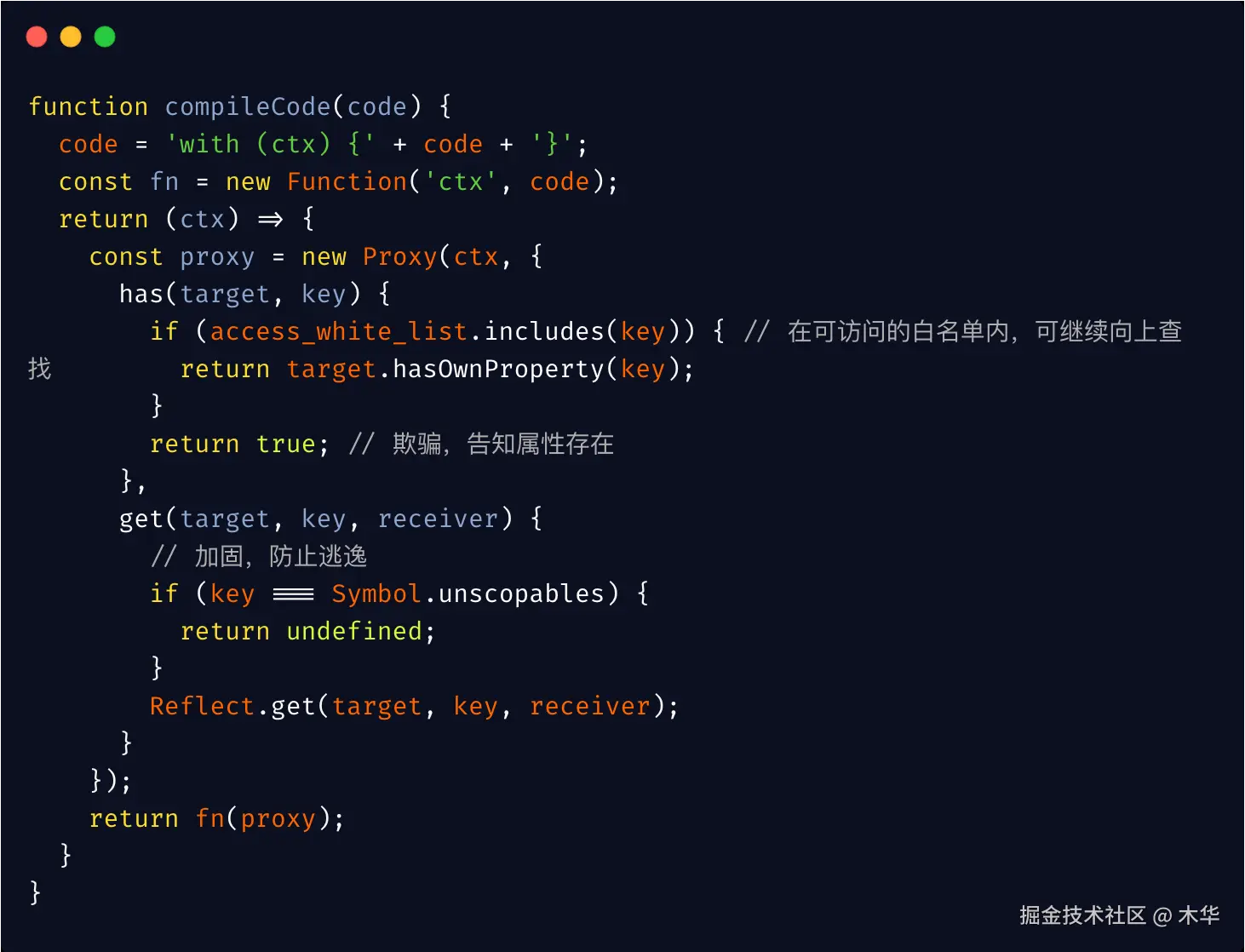 在沙箱环境中,对本身不存在的变量会追溯到全局变量上访问,此时我们可以使用 Proxy "欺骗" 程序,告诉它这个「不存在的变量」是存在的。
