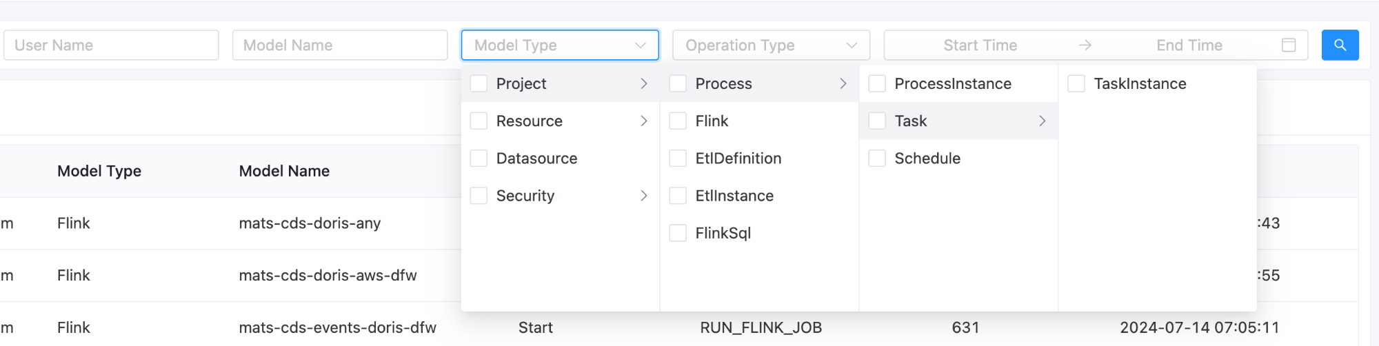 如图就是审计日志的页面,用户也可以按照模块纬度去搜索日志。比如用户想看所有针对于Project的操作等。