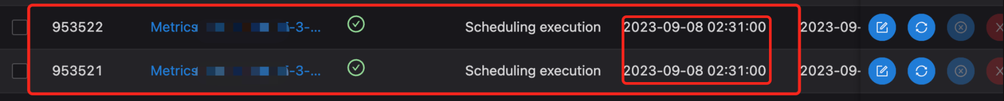 最后,我想与大家分享一个有趣的技术问题。我们之前的监控检测到同一任务在同一时间被执行了两次,可以看到这两个任务实例的调度时间是相同的,并且ID相差1。