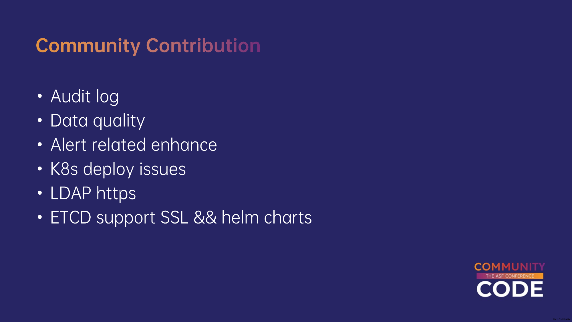 在对社区的贡献方面,我们将绝大多数功能都回馈给了社区。例如,审计日志、数据质量模块、一系列告警优化、K8s部署相关的Bug修复、以及对LDAP和etcd SSL连接的支持等功能。