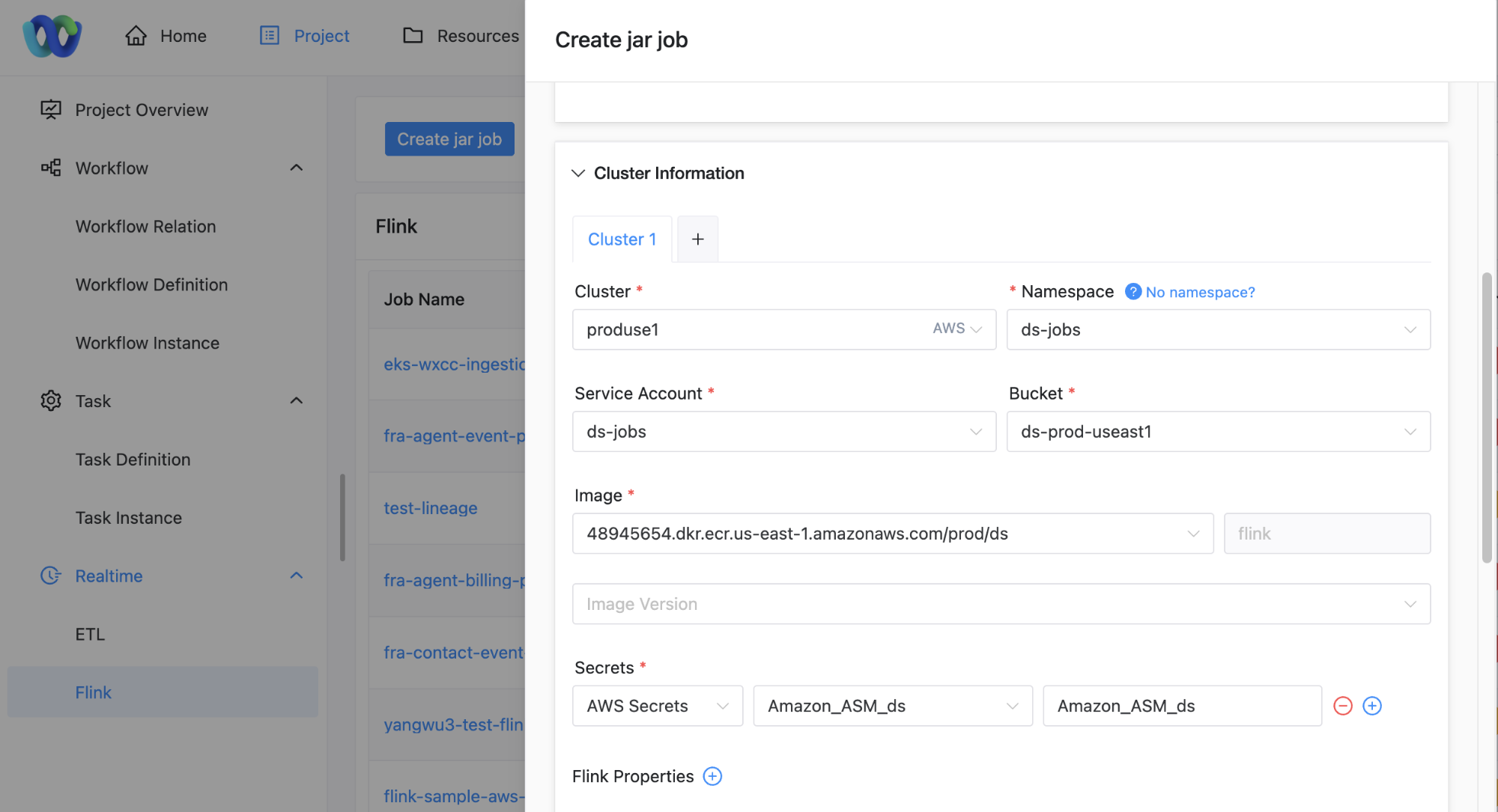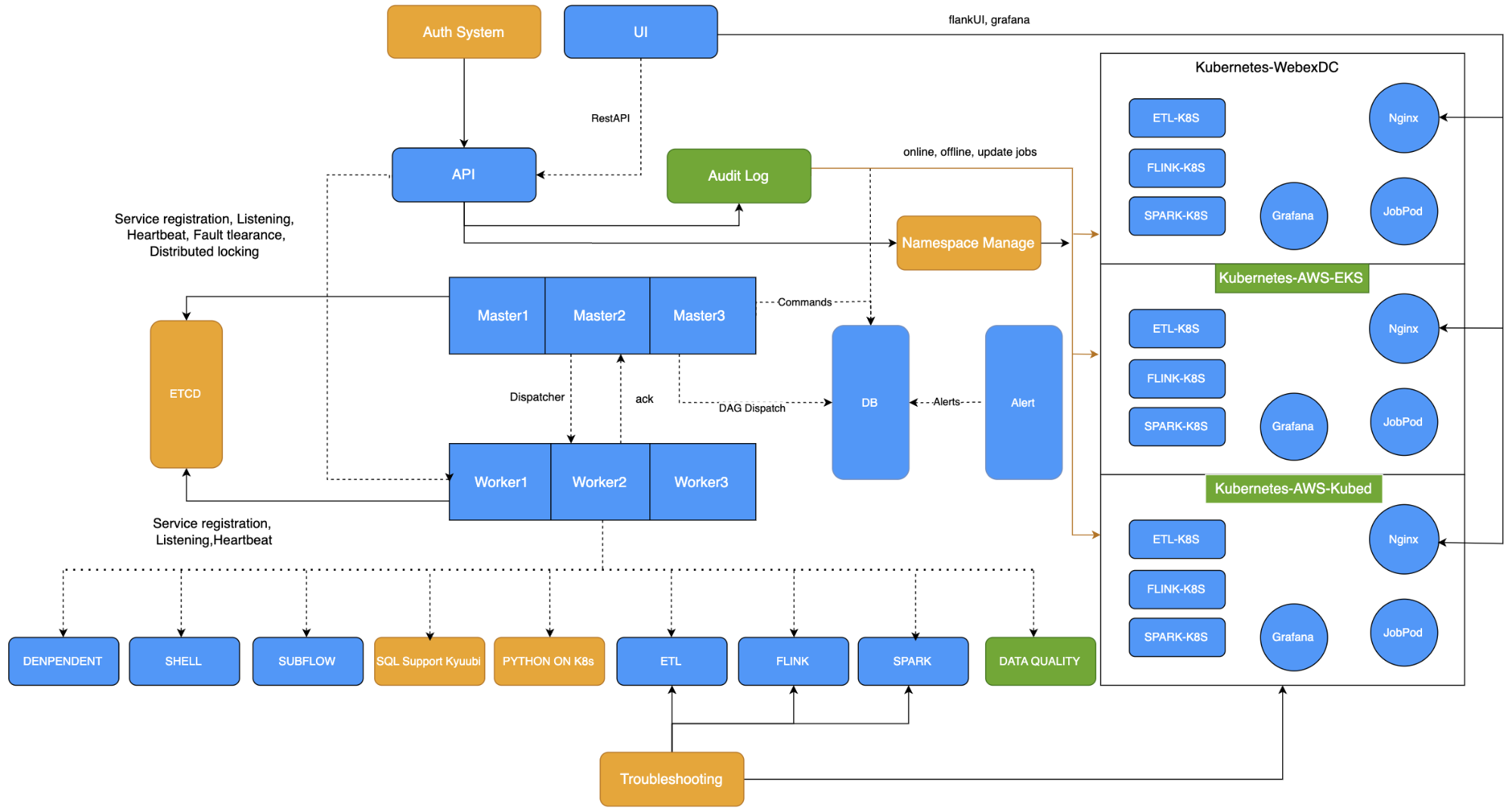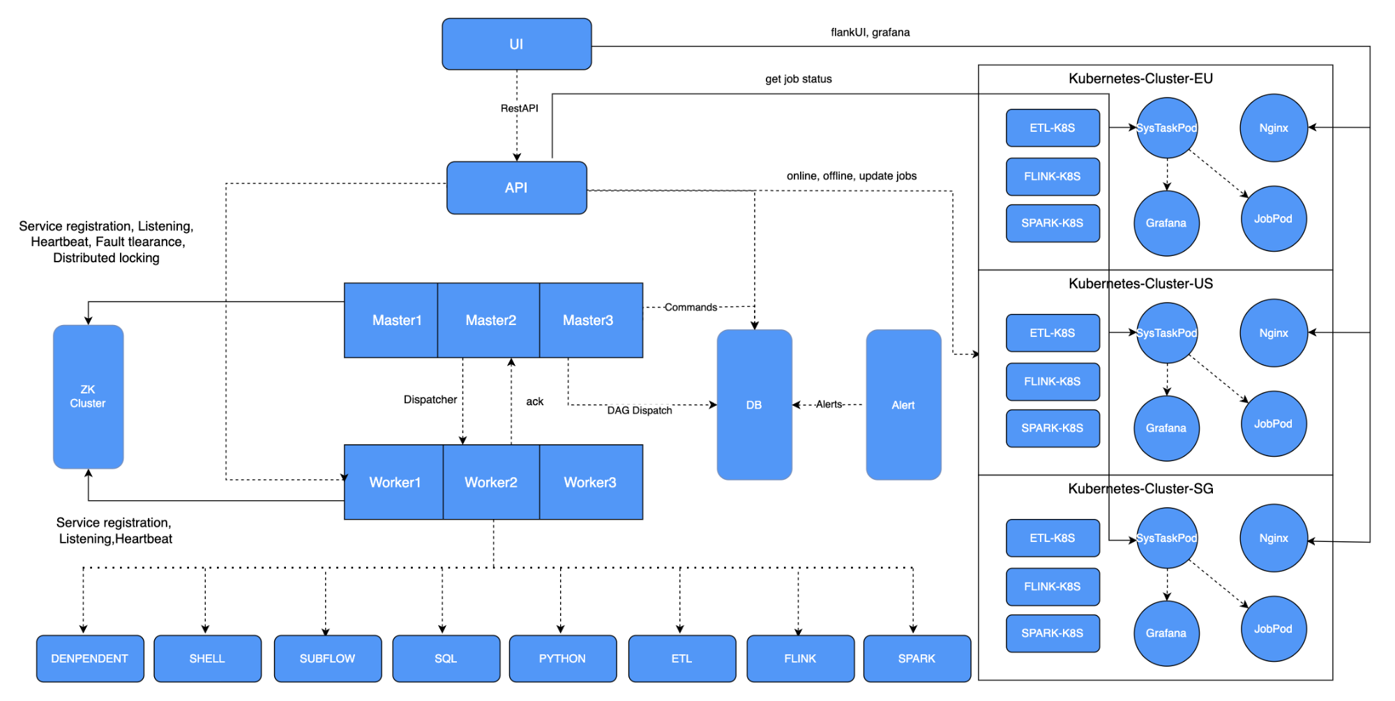 我们使用单个DolphinScheduler服务来控制多个集群,当前支持多个Webex DC。为了支持任务在K8s集群上运行,我们依赖多个组件,包括Docker镜像、JAR包和配置文件,这些资源都存储在AWS S3存储桶中,集群在运行任务时从这个S3存储桶拉取资源。