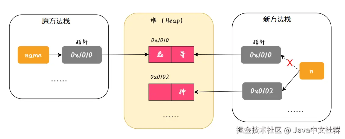 然而,在调用了“n = new char[2];”代码之后,给变量在堆上创建了新对象,此时就不再使用原来的引用副本了,这个时候,再修改新方法中的变量就不影响原变量了,如下图所示: