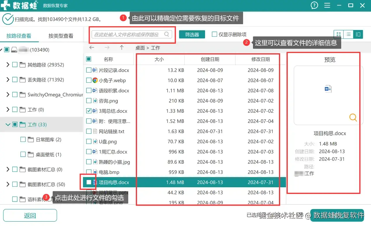 步骤2: 扫描完成后,可以直接通过上方的搜索框来精准定位需要恢复的文件,只要在搜索框里输入文件名或保存路径即可。点击文件就能够进行恢复文件的勾选。