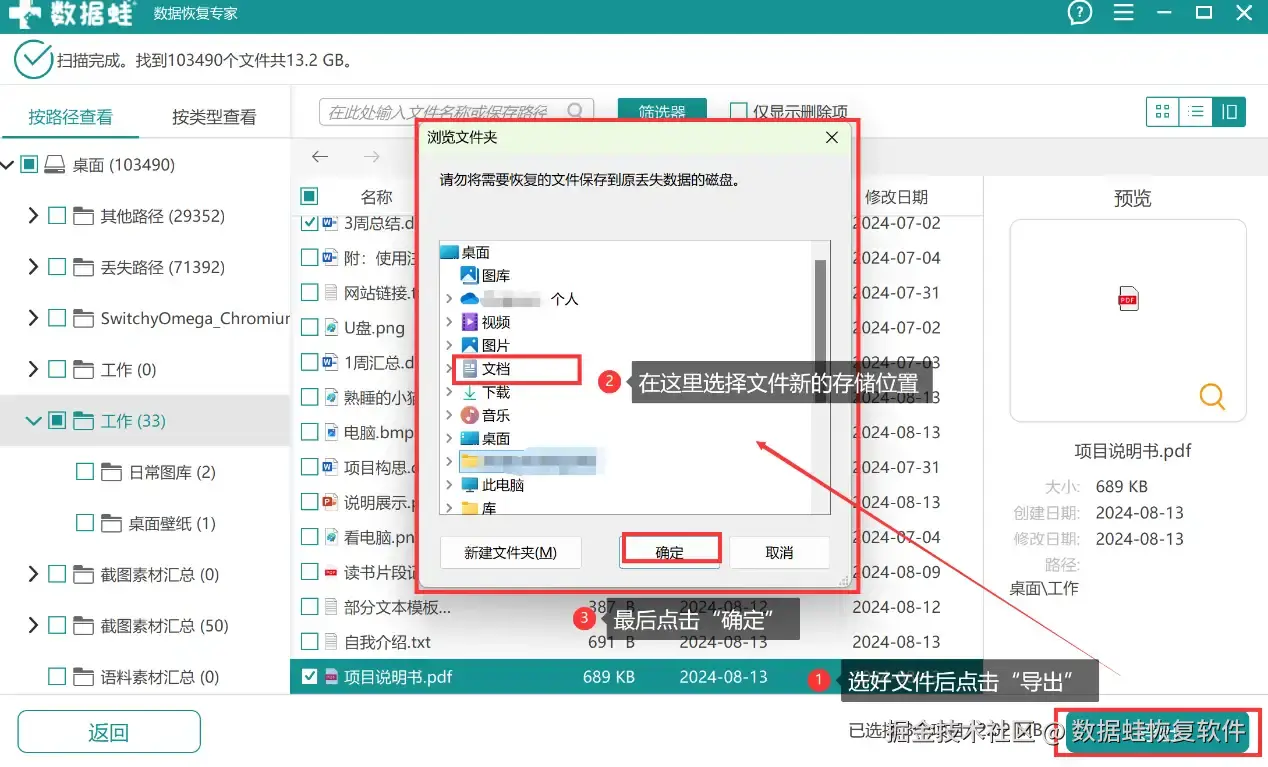 步骤3: 选好需要恢复的U盘丢失文件后,单击“导出”后再在弹出的窗口中选择文件的新存储位置。