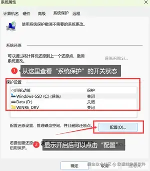 步骤3: 检查是否开启“系统保护”的功能,如开启,点击“配置”后进入新页面,设置电脑还原点。