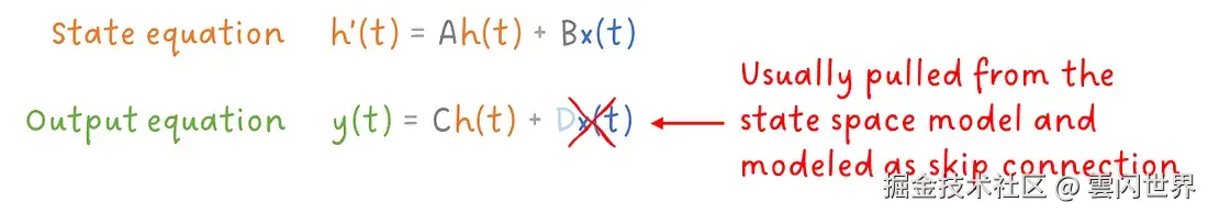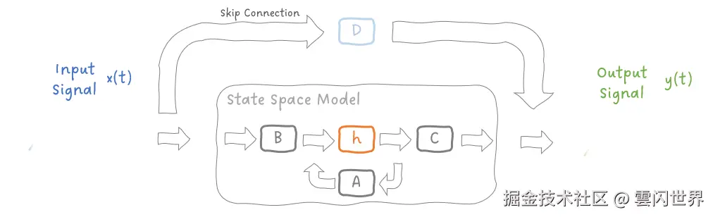 矩阵D将输入x(t)进行变换,并将其映射到输出y(t),这通常包含在经典 SSM 的输出方程中。 然而,当将 SSM 应用于深度学习时,我们会删除此变换并将其建模为简单的跳跃连接,从而简化 SSM。 我们可以用如下框图来表示这些方程: