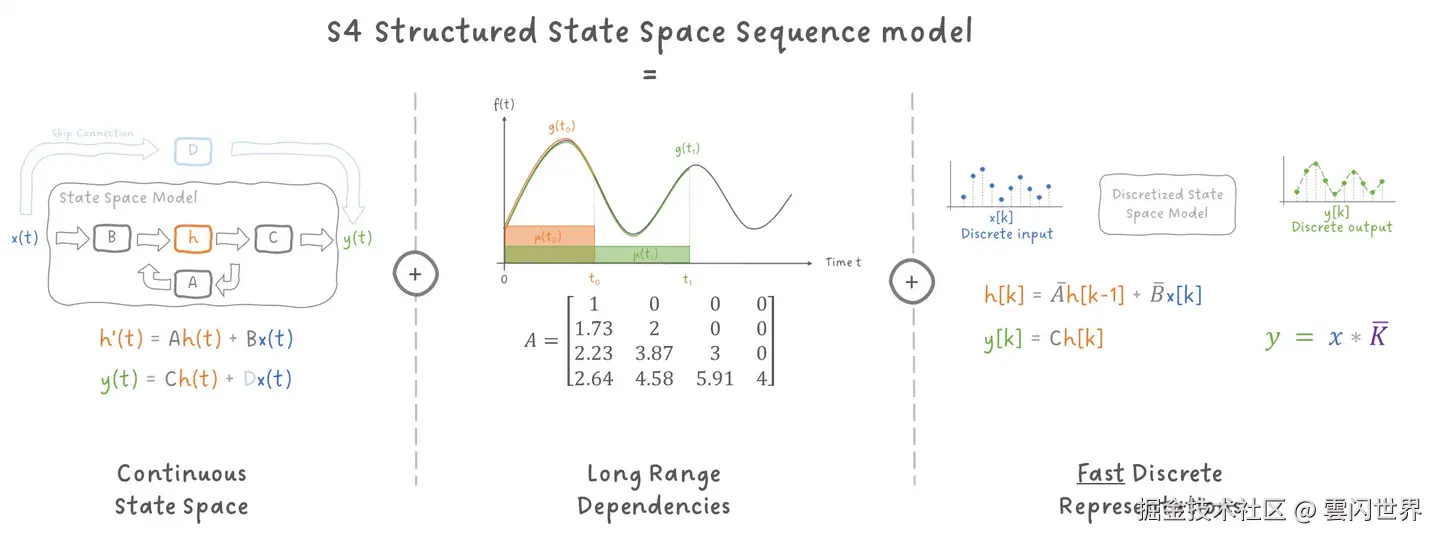对于两者都是密集矩阵的情况,使用我们都知道的矩阵乘法的标准算法,我们需要N³ 次乘法和(N-1)N² 次加法。 如果A是密集矩阵而B是对角矩阵,则这将减少到N² 次乘法和0 次加法。 如果A和B都是对角线,我们只需要N 次乘法,即对角线元素的逐元素乘法。虽然这在硬件资源方面是可取的,但请注意,对角矩阵作为密集矩阵的表现力可能较差,因为它的值较少。像所有事物一样,这是一种权衡。 计算的并行化如果你仔细观察密集矩阵乘法,你可能会注意到,计算输出C 的一行涉及B的所有值,但只涉及A的一行。简单地说,你可以在 GPU 的不同核心上并行计算C的每一行来加快计算速度。这意味着每个核心只需要N²次乘法和(N-1)N 次加法,而不是像单核情况下那样需要N³ 次乘法和(N-1)N² 次加法,因为我们现在有一个向量矩阵乘积,而不是矩阵矩阵乘积。 长话短说,总而言之,使用NxN 方阵的示例,通过尝试利用矩阵的某些属性,我们希望将它们带入一种结构化形式,使得我们需要存储和加载少于N² 的值,并且对于矩阵乘法,我们需要少于N³ 次乘法和(N-1)N² 次加法。 当然,我们还可以采用许多其他矩阵结构,这些结构各有优缺点。在本系列关于 Mamba 状态空间模型的文章中,我们将遇到许多这样的矩阵结构,它们都具有相同的目的:在保持最佳性能的同时减少资源消耗。 4.2 综合起来——S4:结构化状态空间序列模型 S4 旨在通过在相关矩阵上强制执行某种结构来提高 SSM 的效率。通过这样做,它可以应用经过充分研究的代数规则来降低所涉及计算的复杂性并节省内存,尤其是对于卷积视图的核K的重复计算。