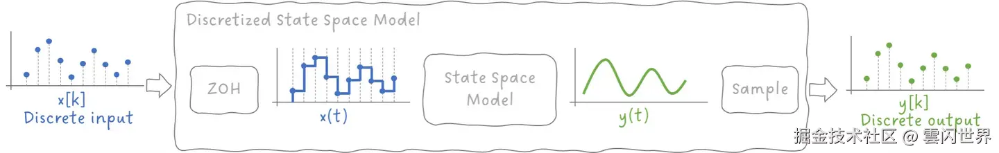 为了离散化我们的状态空间模型,我们使用了系统理论中经常使用的另一个技巧:我们使用零阶保持 (ZOH) 模块将离散信号x[k]转换为连续时间信号x(t),然后将其输入到连续 SSM 中。SSM 将生成连续输出y(t),然后我们对其进行采样以获得离散输出序列y[k]: