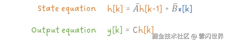 为此,我们将矩阵A和B离散化。这得到了状态空间模型的离散表示,现在包括离散状态h[k]。