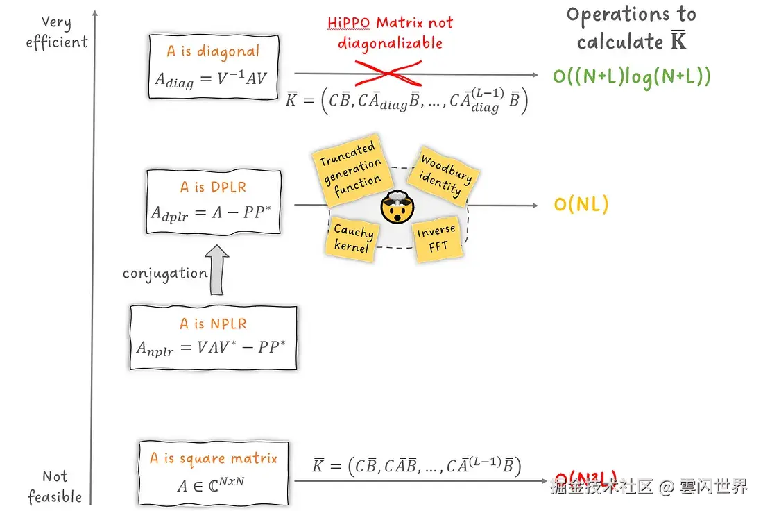 与 LSSL 相比,S4 的速度提高了 30 倍,内存使用量减少了 400 倍,同时性能也有所提升。 S4 论文涉及大量高级线性代数,我将在这篇博文中基本跳过。如果你想更深入地研究数学和代码实现,我建议你查看《带注释的 S4》。 回想一下,计算SSM 卷积表示的卷积核K时,需要对离散化的方阵A进行重复的矩阵乘法。请记住,核的长度与输入序列x相同,并且矩阵A的幂随着核的每次输入而增加。