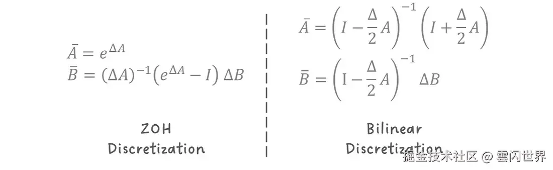 要离散化状态空间模型,我们必须离散化矩阵A和B。最初,大多数基于深度学习的状态空间模型(如LSSL和S4)都使用了双线性离散化,而后来的模型(如DSS和 Mamba)则使用了 ZOH 离散化。现在,我们关心的只是我们需要离散化,而且可能有多种方法可以做到这一点。