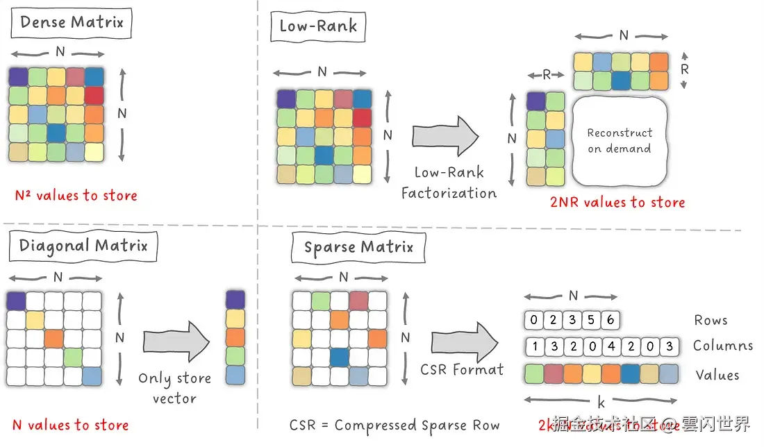 前面提到的 LSSL 确实表明,如果使用 HiPPO 矩阵初始化,则可以训练 SSM,并且确实表明其性能甚至超过了所示实验中的 Transformer。然而,其昂贵的计算和内存要求使得 LSSL 无法作为通用序列模型。直到引入 S4(结构化状态空间序列)模型,这个问题才得到解决,我们将在下一章中讨论这个问题。 4. 为提高效率对状态矩阵施加结构 现在是时候讨论结构化状态空间模型中的结构到底是什么了。我们首先尝试获得一些非常基本的直觉,即结构是什么以及它为什么重要,然后我们将仔细研究 S4 模型。 4.1 什么是结构化矩阵以及它们为什么重要? 让我们考虑一个由NxN 个元素组成的标准方阵。我们将重点关注两个方面: