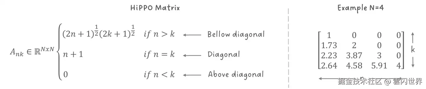 等式 6:N=4 的 HiPPO 矩阵定义和示例。