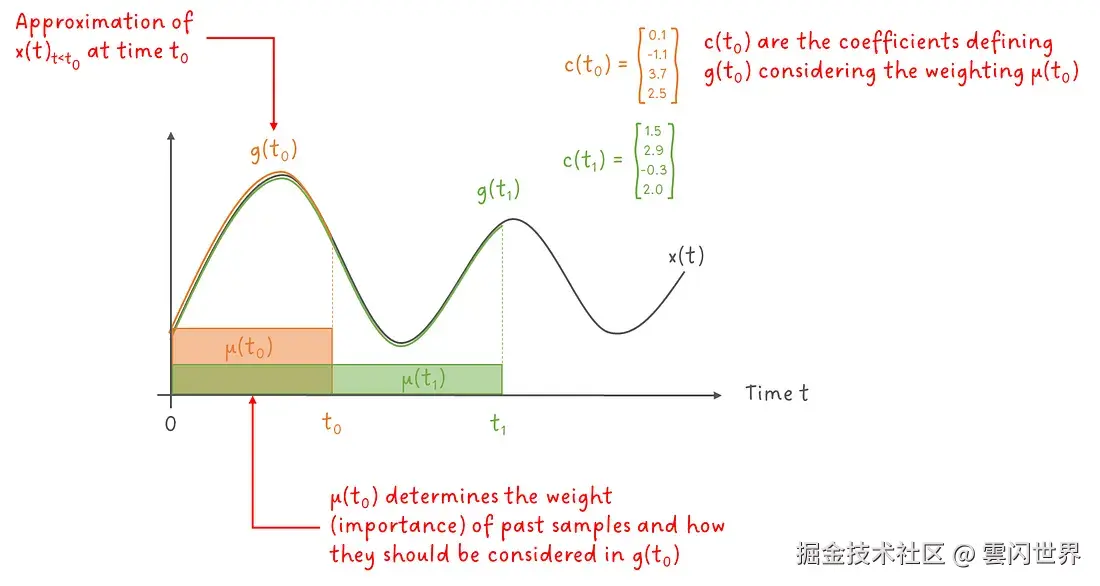 从理论上讲, RNN 和 Transformer 都可以处理永无止境的数据序列(有时人们会说:这些模型是不受约束的)。RNN通过将整个历史记录压缩为单个低维状态来实现这一点。这对于推理非常有效,因为现在下一个状态仅取决于前一个状态和当前输入。RNN 的性能取决于模型学习进行这种压缩的能力。此外,对于长序列,尤其是由于梯度消失,这不是一项容易实现的任务,即使对于使用 GRU 和 LSTM 等门控机制的更高级 RNN 也是如此。另一方面, Transformer根本不压缩历史记录。它通过其注意力机制考虑整个历史记录(以及未来,如果没有像自回归生成那样被掩盖)。这允许并行训练 Transformer,但同时在推理过程中,随着序列长度的增加,内存和计算需求也会激增。 ❓ 那么,再问一遍:我们该如何在高度压缩的状态下处理长距离依赖关系,而不会在训练过程中遇到困难,同时实现高性能? 一种解决方案:我们使用HiPPO(高阶多项式投影运算符)框架初始化我们的矩阵。 3.2 HiPPO 框架 主要思想是从状态方程中参数化矩阵A和B,以便我们可以重建任意给定点的历史(即从时间t=0到t=now 的输入信号)。具体来说,如果状态表示为某些正交多项式(例如勒让德多项式)的某些系数,我们可以简单地评估多项式以重建到当前时间的输入信号。 例如:我们有一个输入函数x(t)。在任何给定的时间步长ti,我们希望找到一个重构函数g(ti) ,它对于ti之前的所有t ,在 t<ti 时近似x(t)。近似值g(ti)由系数c(ti)完整描述,该系数可以插入勒让德多项式以重构g(ti)。