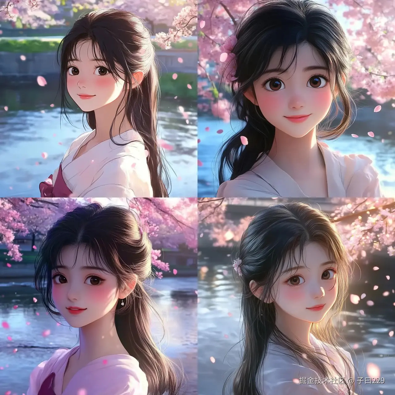 宫崎骏风格,一位可爱的少女,拥有大大的眼睛和精致的发型,在河边,周围是五彩斑斓的樱花飘落,8k--version 6.1