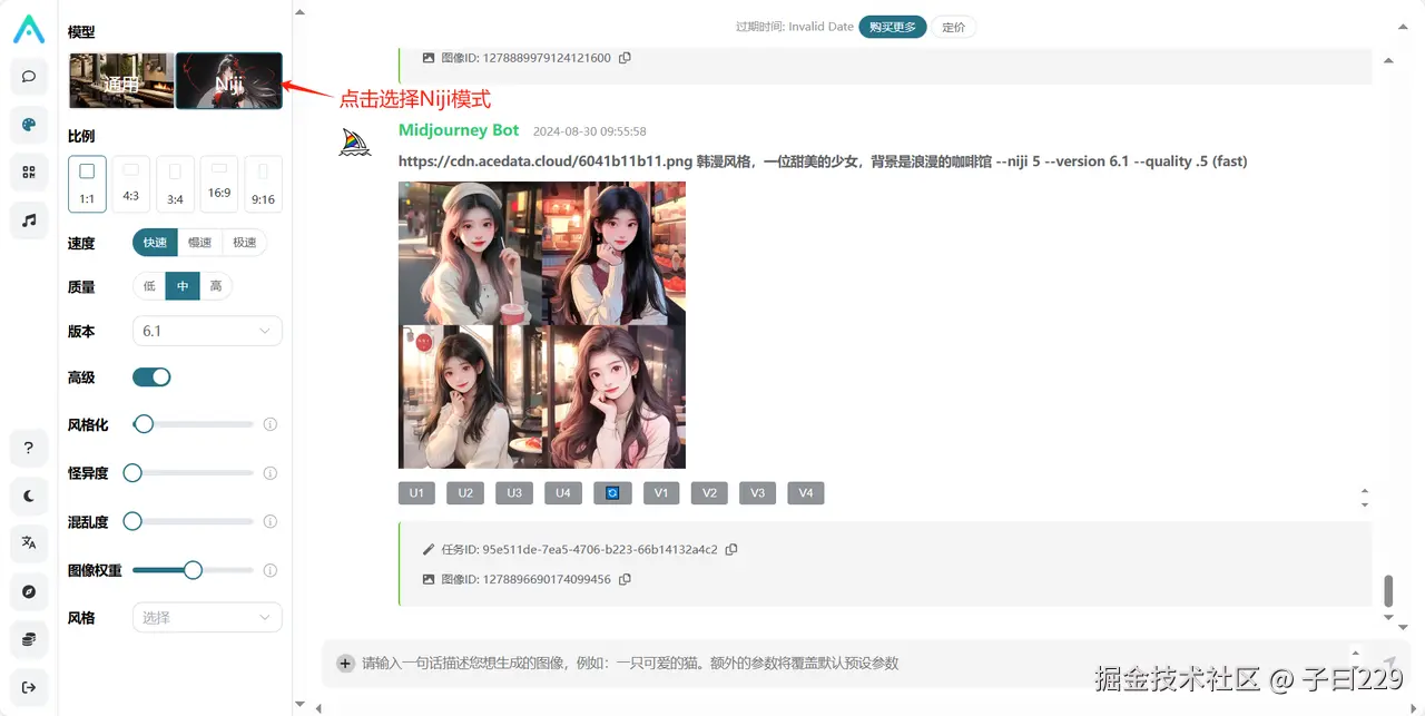 Midjourney的Niji模式是一个专门训练用于生成动漫风格艺术的AI模型,它拥有丰富的动漫知识。最特别擅长创建动态和动感十足的镜头,并且非常注重角色和构图。在界面左上,选择Niji模式即可使用。