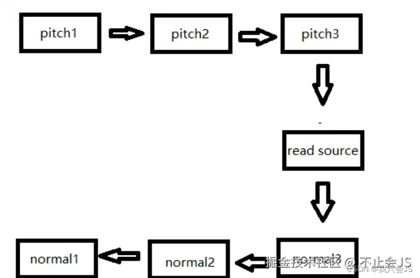每个loader还有一个属性pitch,是一个函数(loader本身也是一个函数) ,我们称这个属性为pitchloader,而我们的loader称为normalloader,runloader函数在遍历执行loader时(runloader是源码中的函数,想要了解webpack源码,可以看我的另一篇文章webpack源码解析),它首先遍历pitchloader,并将index++,在遍历normalloader,并将index--,这样便形成了先正着调用pitchloader,在反向调用normalloader,具体流程如下