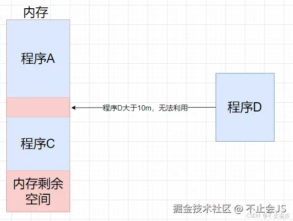 此时如果程序B下线,程序A和程序C之间便会空出10m内存,此时如果没有10m以下的应用启动来填充这部分内存,那么这部分内存资源便会被浪费。