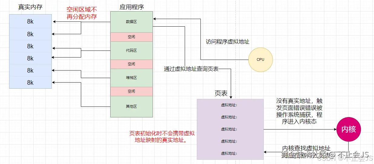 当cpu需要执行应用程序的机器码时,需要通过页表查询真实物理地址,第一次访问时页表并没有记录相关信息,此时会触发页面错误。操作系统在捕捉到这个错误后,会跳转到应用程序的内核态,获取对应的页框填充页表信息,也就是说只有当页面虚拟地址被访问时,其页表中的虚拟地址映射的页框才会被填充。