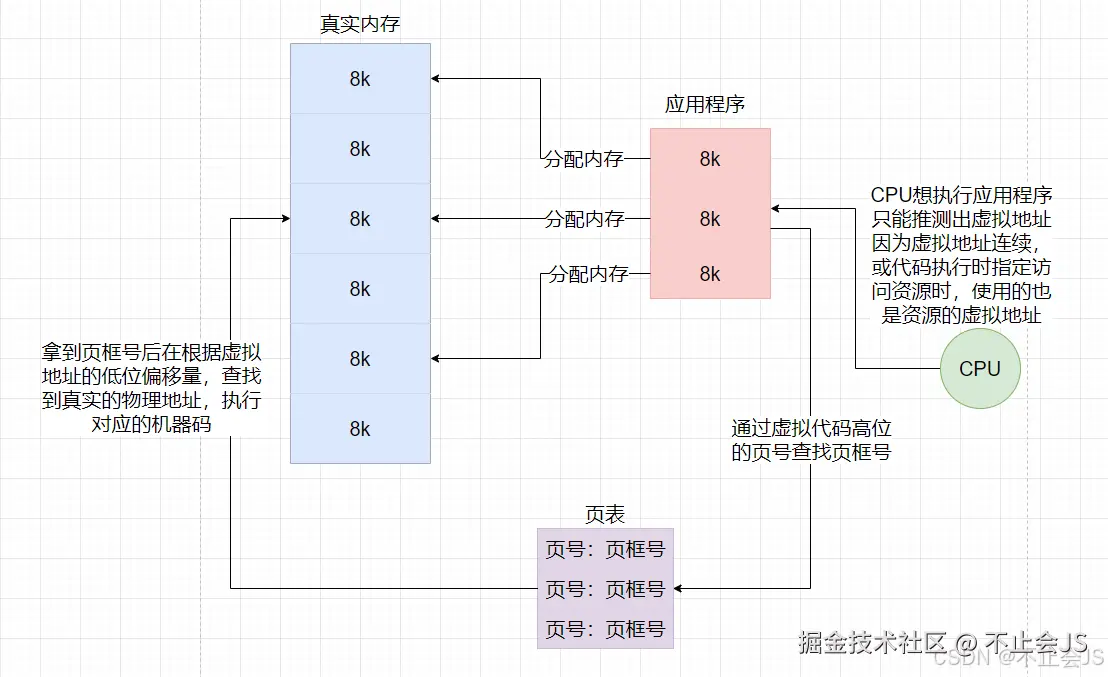 当cpu执行当前应用程序的机器码时,首先它会根据连续的虚拟地址去页表中查找真实的物理内存页,再通过低位去找到物理内存页的对应偏移量的真实物理地址。