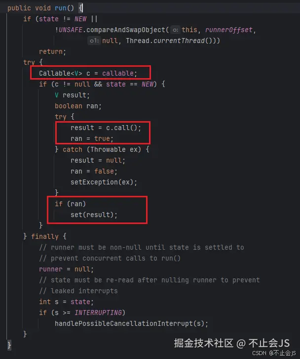 前两种书写简单,较好理解,都是通过实现run方法,再通过调用线程实力的start方法在新线程上执行run方法,不同的是第二种是实现的接口,而实现接口意味着它可以实现很多接口,并且继承其他类,有更好的扩展性(实际上也不常用),而第三种则比较复杂,传来传去,最终还要通过调用get方法获取线程的返回值,那他是怎么做到的呢?以下的源码实现: