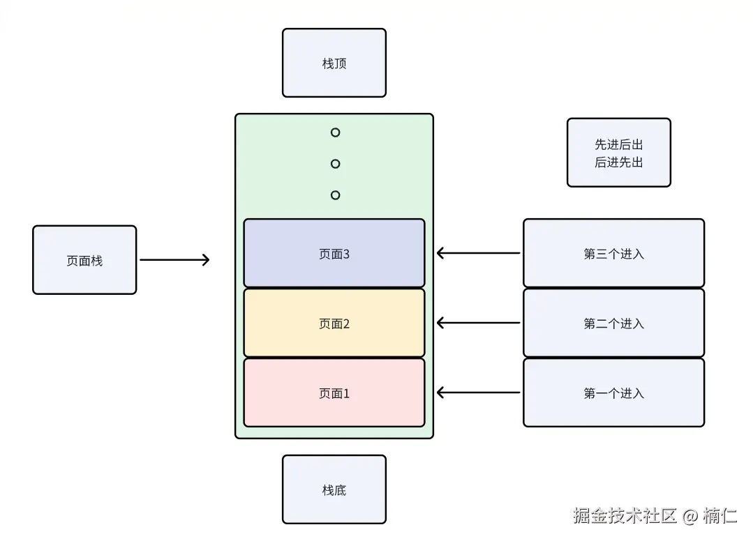 用来存储程序运行时页面的一种数据结构 遵循先进后出原则,最大容量是32个页面,可以通过router.getLength()查看页面栈中页面的个数,