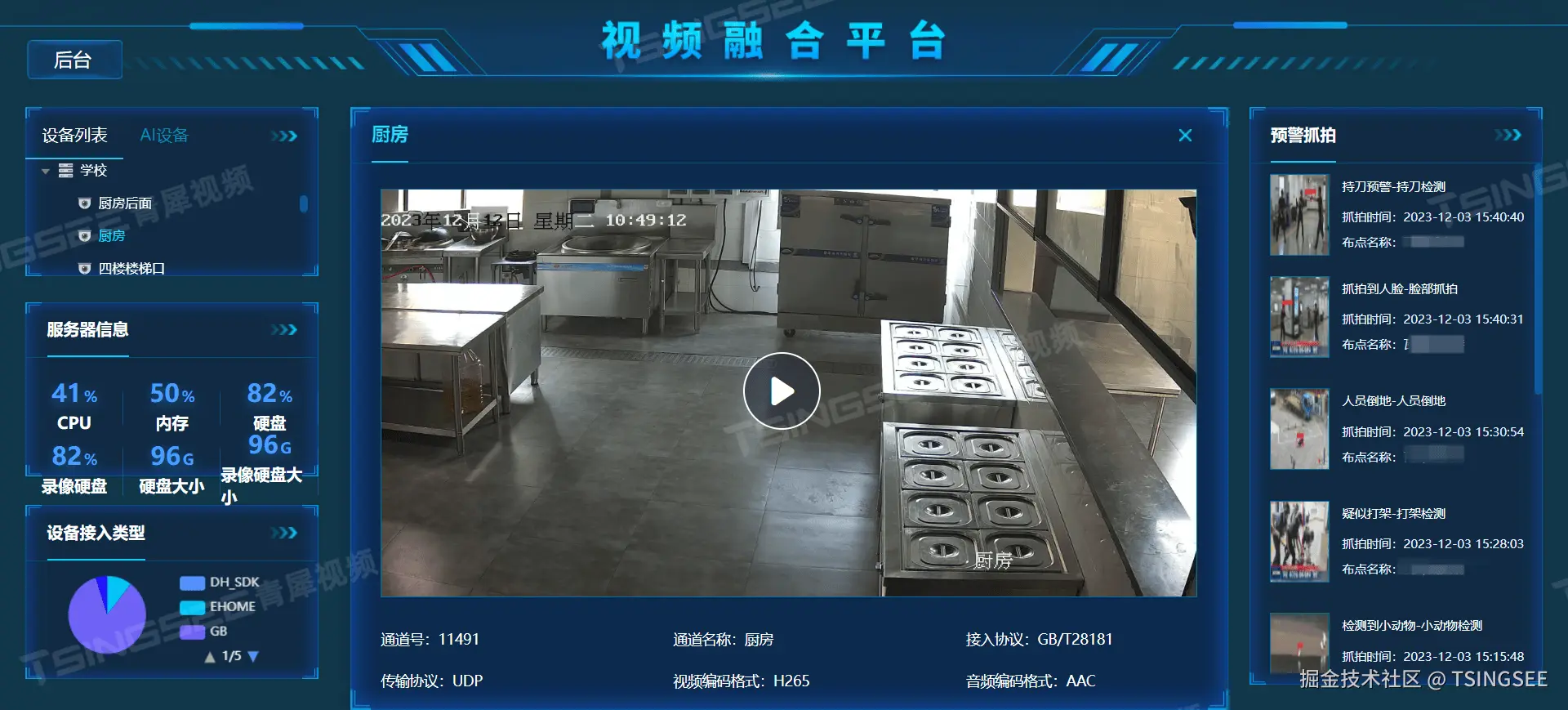 旭帆科技青犀视频智能监控系统EasyCVR视频汇聚平台凭借其全面的技术优势,在食品卫生安全领域发挥着重要作用。该平台支持多种视频源接入,包括IPC、NVR、执法记录仪、移动单兵、无人机、视频平台等多种设备/平台,能够轻松实现餐饮后厨、食品加工车间等关键区域的视频监控。