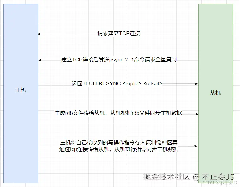 当我们在从机配置文件中配置replicaof(老版本是salveof)加上主机ip时,从机启动后则会主动向这个ip请求建立tcp连接。成功建立tcp连接后,从机会像主机发送一条指令psync ? -1(具体意思后面说),接收到这条指令后,主机返回+FULLRESYNC