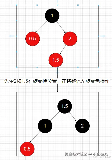 但如果新增节点为右侧子节点的左侧子节点呢?那么则须先将两个红色节点进行反向旋转,在将整体旋转变色,如下图