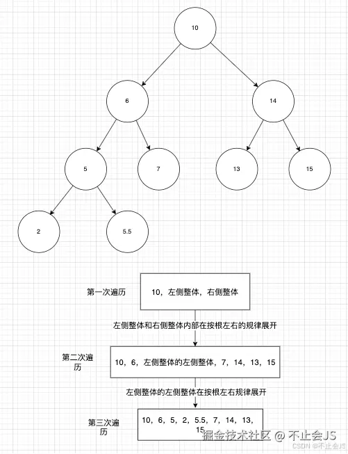 先访问根节点,在访问左节点,在访问右节点,其中从跟节点开始左侧和右侧都看成一个整体,整理内部在根据这个条件进行遍历,如下图(过程方便大家理解,实际代码实现可能会有不同)