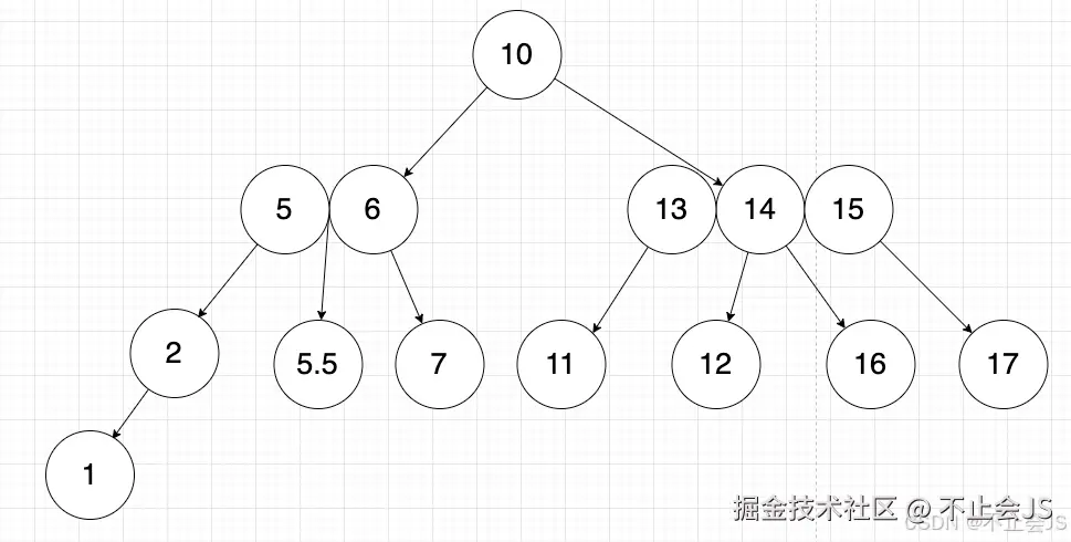再次来到元素时会和父节点进行比较判断加入左侧节点还是右侧节点,当子节点变成四个元素时继续分裂。但与众不同的是他不会向下排布,而是上提,也就是说分类出来的父元素和当前节点的父元素合并为一个二元素节点,而分裂出的两个子节点为这个二元素节点的字节元,这就是说为什么时拥有n个元素的节点被允许拥有n+1个字节点,如下图。