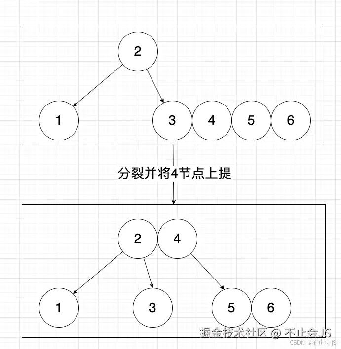 而当父元素为四个元素时依旧会分裂,而其分裂后的子节点要成为其原本子节点的父节点。不过这个过程需要一定的运算,因为多元素的子节点大小不一,分配位置是需要保证二叉树左小右大的结构不变。