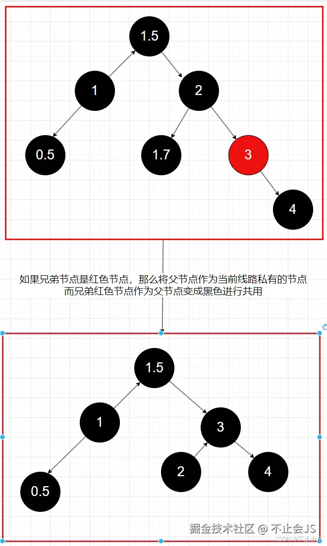 删除的平衡处理实际上是要借助旁边的线路通过旋转和变色操作公用节点,并且帮正旁边的线路的黑色节点数不受影响,当旁边的线路通过旋转变色无法完成这一功能时,则需要对整个二叉树的大量公用节点进行变色处理,使所有线路的黑色节点数减一