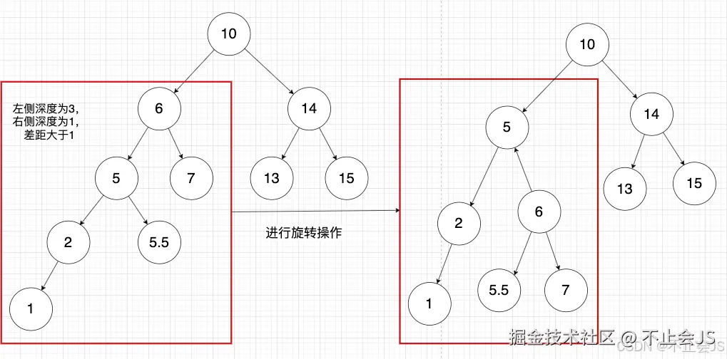 当一直为二叉树添加比根节点大或者小的节点时,会造成二叉树一侧深度过深,结构接近链表,为了防止这种情况,AVL树通过比较节点两侧深度 **(差距不能超过1)**来折叠节点,来防止这种情况,当左侧节点过深右侧节点过浅时,AVL树会找到左右两侧中间的节点(可以将当前节点左侧所有节点和右侧所有节点连起来看成一个链表,然后拿到中间的节点),然后以此节点旋转来作为父节点,如果折叠后的中间节点原来有右侧子节点,那么则将右侧子节点挂到中间节点的新的右侧字节点 **(也就是当看成链表时,中间节点的右侧姐带你)**的左侧字节点以保证二叉树结构不变 (每个节点都要进行这种判断,以保证二叉树平衡,为了不重复判断,应该先从叶子节点开始判断),当右侧过深时同理