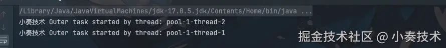 System.out.println("小奏技术 Outer task started by thread: " + Thread.currentThread().getName());