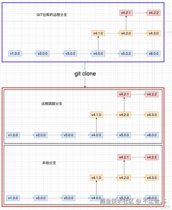 当对一个远程git仓库调用git clone时,会将远程分支复制到本地作为远程跟踪分支和本地分支,如下图