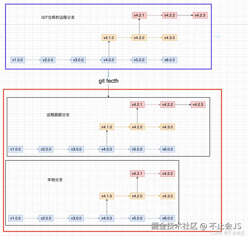 当调用git fetch时会讲远程跟踪分支的最新更新到远程跟踪分支,如下图