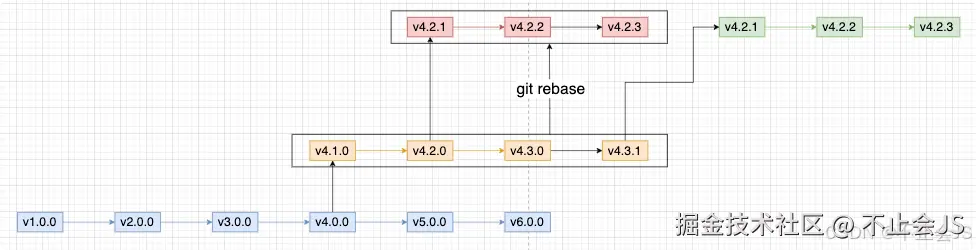 而rebase则是将目标分支拖离远来的基点,拼接到目标的末尾,并且将基于原来基点的改变,变为基于当前基点的改变,如果当前基点相较于原来基点的改变和本次rebase发生冲突,那么则需要认为解决冲突。如下图
