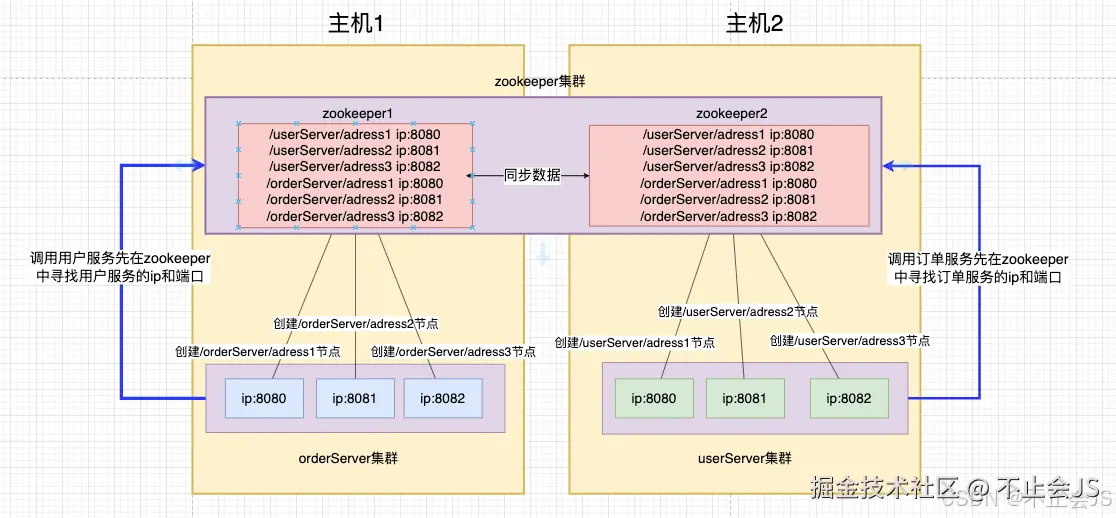 假设一个系统值有一个用户服务集群和一个订单服务集群,他们使用zookeeper注册服务并相互调用,那么他们的结构如下图