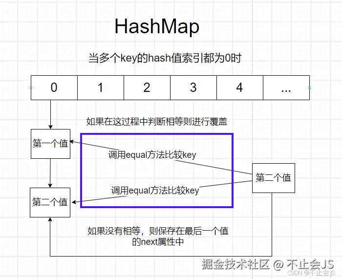 当匹配到的索引位置已经有值时,他会和当前索引中保存的所有key通过equal方法进行判断是否相等,如果相等则进行覆盖,不相等时,则保存在最后一个值的next属性中,作为链表保存。